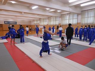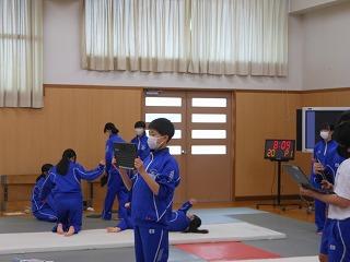 保健体育の授業は1・2年生がバスケットボール・マット運動、3年生はバスケットボール・卓球に行っています。授業も後半に入り、バスケットボールはゲーム練習、マットは自分の演技の組み立てに取り組んでいます。