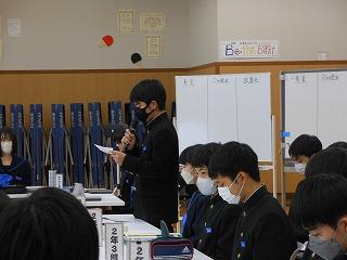 昨日の午後は各クラスで後期生徒総会に向けての学活を行いました。テーマ「よりよい津幡南中学校を自分たちで作り上げよう」に基づいて、各クラスの学級目標の達成度と、残りの学級での生活で達成度を高めるためにはどんなことが必要かを考えました。考えた取組は2月15日の生徒総会で各クラスの代表が発表します。