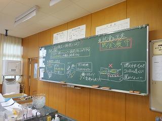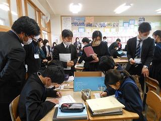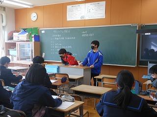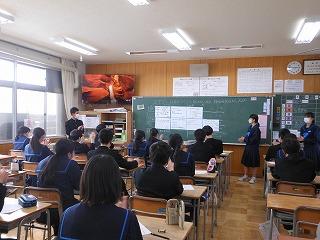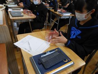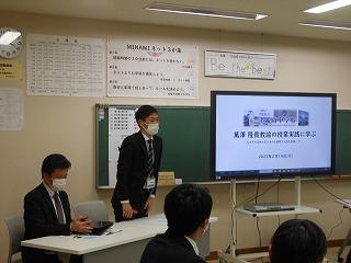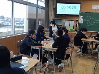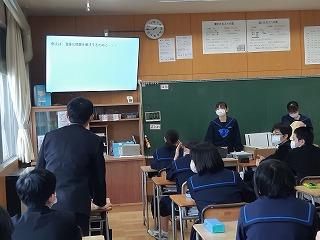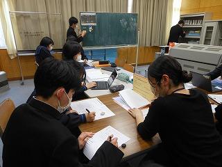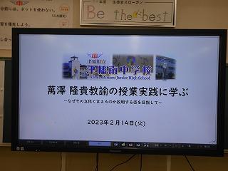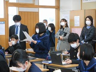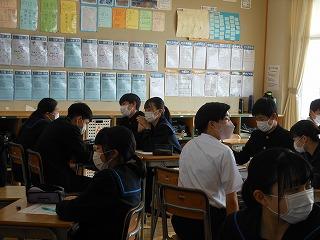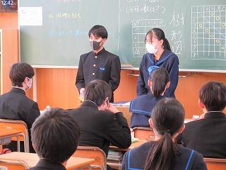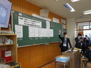 14日(火曜日)に石川県教育委員会の先生をお招きして、今年度最後の校内全体研修会を実施しました。1年5組の教室で本校研究主任の萬澤先生が空間図形の授業を行いました。「投影図から正しい立体を見つけることができるだろうか?」を課題にペア対話やグループ活動を行いながら、積極的に授業に取り組んでいました。