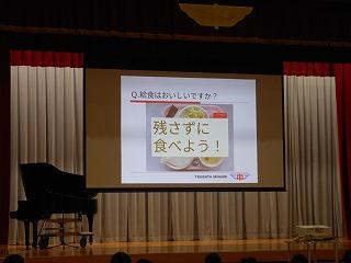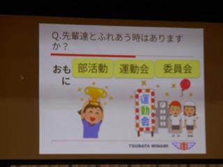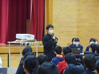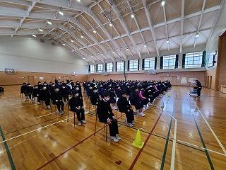 今日の午後、来年度本校に入学する小学校6年生が体育館に集まり、新入生説明会を行いました。4月から後輩となる約180名の児童を前に、2年生の学年プログラム委員会の皆さんが頑張ってくれました。前半の説明に続き、4つの部活動紹介、最後に〇✕クイズを行いました。