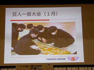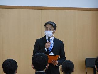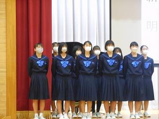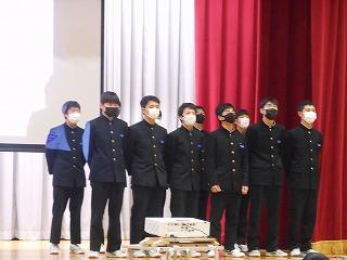 まずは表彰披露です。吹奏楽部の新人戦やボート部のインドアローイング大会、津幡町英語スピーチコンテスト、人権作文などの表彰生徒がステージに上がりました。