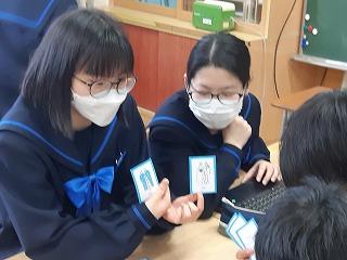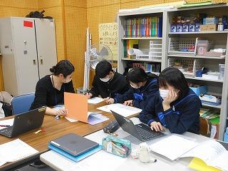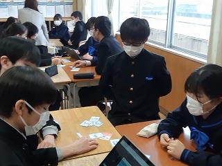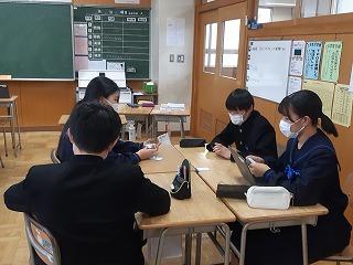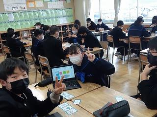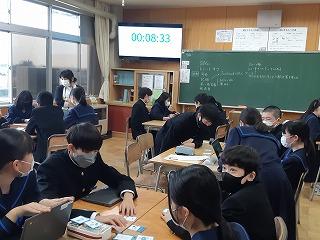 3年生の英語科では教科書の学習内容が終わり、これまでの復習プリントに取り組むことが多いのですが、ALTのクロエ先生が来られる時にはペアワークやグループ学習をしています。2組の英語では既習の熟語を使って、3~4人で文章を考える活動を行っていました。