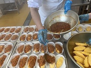 今日の給食はあんくるくるパンとオムレツミートグラタン