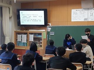 1年生は今日の午後、総合的な学習の時間に各自が調べた「職業調べ」学習の発表会を行いました。自分が興味をもった職業について、Googleスライドを作成し、学級の生徒の前で発表しました。本校のカリキュラム・マネジメントの柱は表現力の育成です。教科で培った力を総合的な学習の時間でも発揮しています。