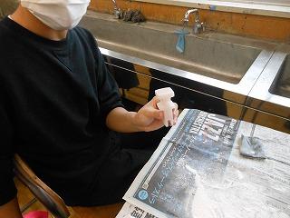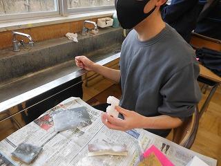2年生はオリジナルの抽象彫刻づくりに取り組んでいます。授業では、具象化と抽象化について学び、イメージを形にする展開図を作成した後、実際に石にデザインし、彫刻刀で彫っています。どのクラスも完成間近で、磨きの作業に入っていました。