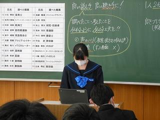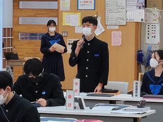 最後に生徒会タイムです。重点委員会の美化委員会から無言清掃の徹底について呼びかけがありました。また、選挙管理委員会より令和5年度前期生徒会役員選挙の公示されました。執行部からは水越さんが生徒会組織について、杉本くんが後期生徒総会について、全校生徒に説明をしました。