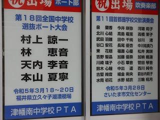 今年度末の3月に、全国レベルの大会に出場するボート部と吹奏楽部の皆さんの健闘を期待して、PTAより生徒玄関横に「祝出場」の掲示をいただきました。ありがとうございました。