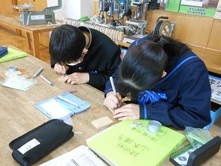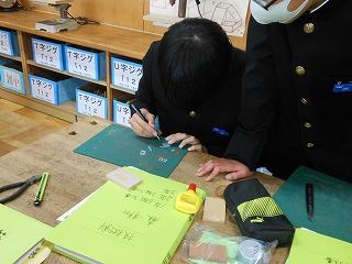 2年生の技術は金属加工に取り組んでいます。基本的な学習をした後、一人ひとりオリジナルのキーホルダーを制作しています。今後は「鋳造したキーホルダーの鏡面を仕上げるにはどのように磨いたらよいか」で仕上げの行程に入ります。