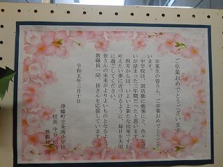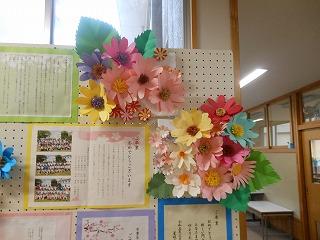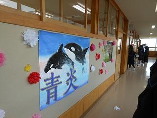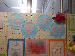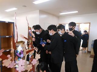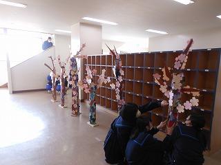 美術部と1・2年生の生徒が美術の時間に合同で制作した「卒業おめでとう」の立体展示が展示ホールに登場しました。満開の桜の木と花形の1・2年生のメッセージが咲き誇る木々が来週金曜日の卒業生の門出を祝っています。