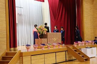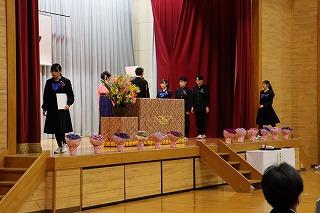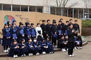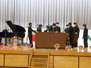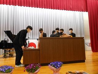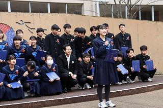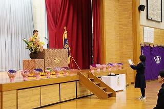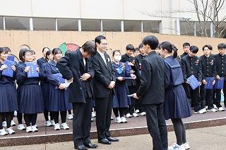 ▽24日に行った離任式の様子です。生徒を代表して、生徒会副会長の得能倖太くんがお別れの挨拶をし、学級や部活動の代表生徒が花束を贈呈しました。