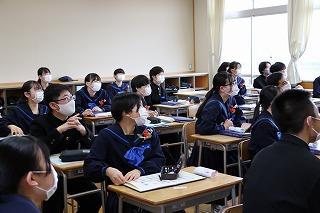 1年生の家庭科では学習のまとめとして、理想の間取りの設計を行いました。地域の方から寄贈いただいた大型モニタを早速使用して、西谷先生の説明を聞き、一人一人が間取りを工夫していました。