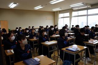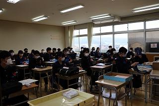 いよいよ公立高校一般入試。今日は授業2時間の後、学年集会と受検校別打合せを行いました。この後、給食を食べて、午後1時に完全下校となります。