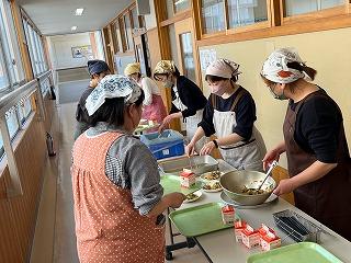 給食調理の動画を視聴したり、給食の大切さについて濱本栄養士の講話を聞いたりして、給食の大切さについて考えていただく機会になったと思います。また、1年生の給食準備の様子も見ていただいたり、また、実際に身支度をして、給食の盛り付け等にも協力していただいたりしました。