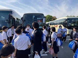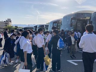 生徒たちは17:00に清水寺の駐車場に集合し、大阪キャッスルホテルに向けて、バスで移動を開始しています。