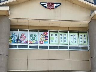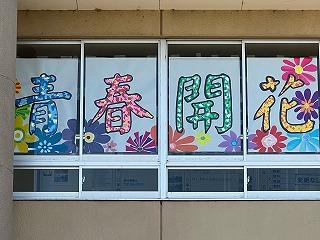 今年度の生徒会スローガンである「青春開花」が、校舎の窓に掲げられました。