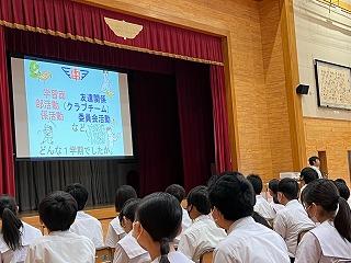 校長先生から、どの部も自分を輝かせる場として大会で頑張っていたこと、また、1・2年生で始まるプール学習で気を付けてほしいことについてお話がありました。そして、レスリングの金城梨沙子さんの言葉から、390日後のパリオリンピックの時期の自分を想像して、その時の自分にどんなメッセージを送るのか、考えてみよう、そして、それを考えて、挑戦を続けよう、自分を変えるのは自分自身である、というメッセージをいただきました。