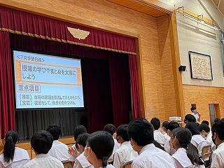 学校生活については、茶谷先生から今月の生活目標『生活習慣を振り返り、自分を高めよう』についてのお話がありました。時間を守ること、持ち物の整理整頓、制服の着こなしについて意識してほしいと思います。