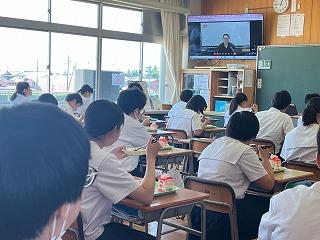 雨野先生は、英語を勉強して海外で教師になりたい、という夢を実現させたこと、みなさんも夢をあきらめないでがんばってほしいことなどを、給食時の放送で話してくれました。