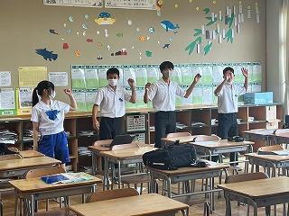 本日の登校日、帰りホーム後に3年2組の大島颯太君の校長先生への表敬訪問が校長室で行われました。