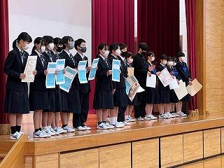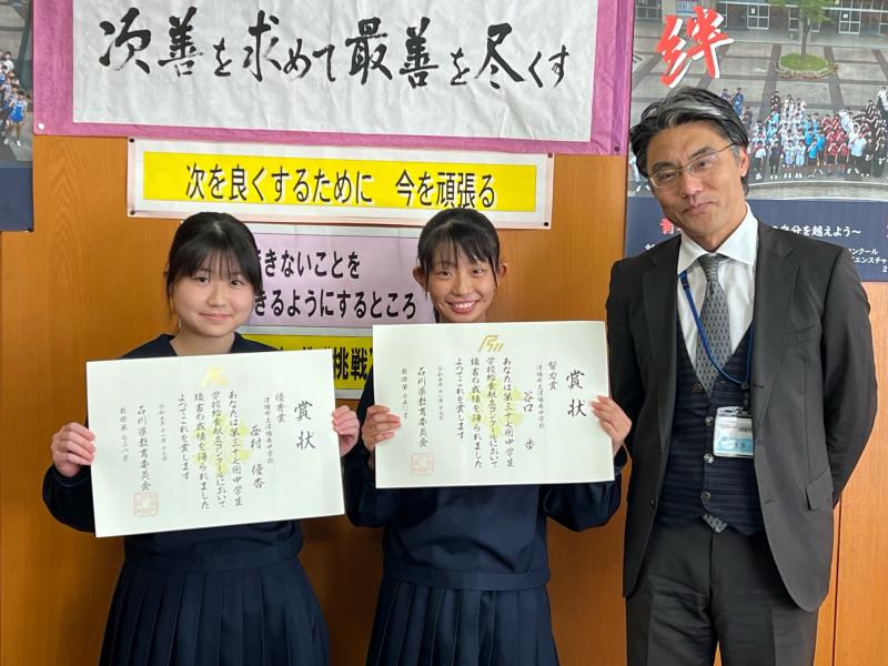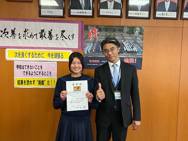 本校からは、2年生の西村優杏さんが優秀賞、谷口歩さんが努力賞に選ばれ、表彰状が授与されました。