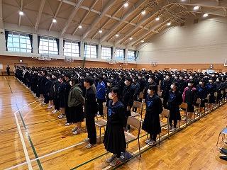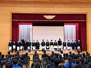 はじめに、表彰披露が行われ、加賀地区新人女子剣道大会での準優勝や、給食コンクール優秀賞、努力賞を受賞したことなどが披露されました。