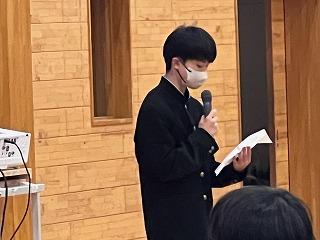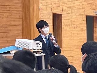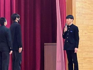 生徒会からは委員長の岩本琉良さんから「選んで持ち帰ろうプロジェクト」の全校アンケートについての報告がされました。昨日の生徒議会で出されたデメリットについての改善策を協議したことを踏まえ、来週の生活委員会でルール作りを進めていく、という提案です。カバンが重いという意見は、生徒のみではなく、保護者のみなさんからも度々いただきます。生徒たちの意見も踏まえつつ、3学期は自分で学習用具を選んで持ち帰るという方向でルール決めを進めています。