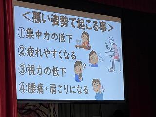 12月の学習目標「自分に厳しく学習態度を振り返り、自身を高めよう」についてのお話のあと、学習に向かう「姿勢」の大切さについてのお話がありました。いい姿勢は学習効率のアップにつながります。そのメリットについての紹介がありました。