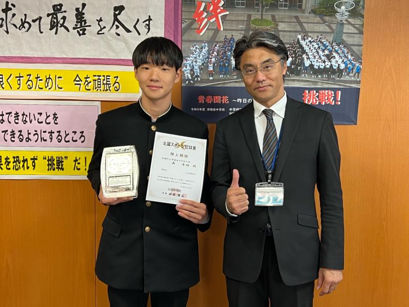 県陸上競技大会男子共通800mで標準記録を突破し、全国大会へ出場した実績が評価されての受賞です。
