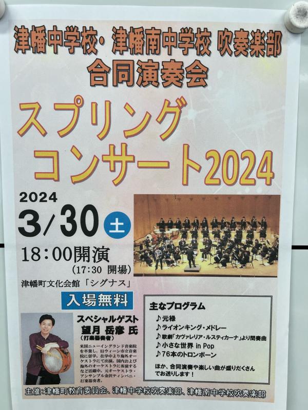 昨日18:00より、津幡町文化会館シグナスで津幡南中学校と津幡中学校の吹奏楽部によるスプリングコンサートが開かれました。大変盛況で、春の訪れを感じさせる活気のあるステージとなりました。