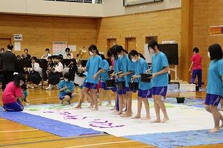 文化祭初日の午後、美術部と吹奏楽部がコラボレーションし、能登半島地震復興をテーマにした書道パフォーマンスが行われました。