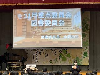 生徒会からは、今月の強化委員会である図書委員会の水岡委員長から、図書貸し出しスタンプラリーのお知らせがありました。