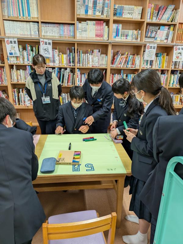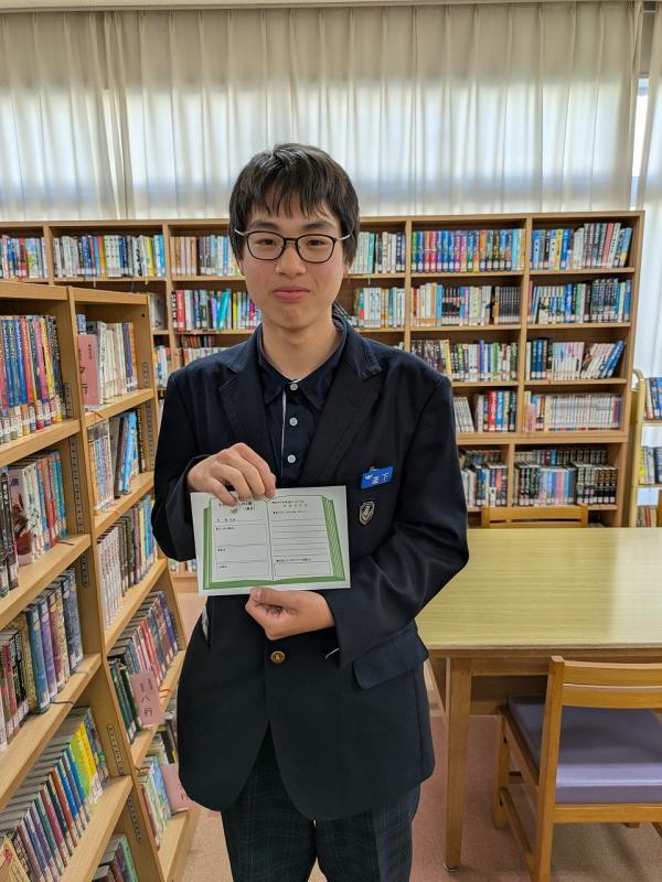 本日(5月7日)、放課後、1・2年生の図書委員の皆さんが集まって「みんながより読書に親しむ」ための取組を行っていました。本校では、1・2年生が毎日朝読書を実施し、15分間という短い時間ではありますが静かに本を読んでいます。図書委員の道下肇さん曰く、「54字の物語」という本がお勧めで、短い物語がたくさんあっておもしろいそうです。