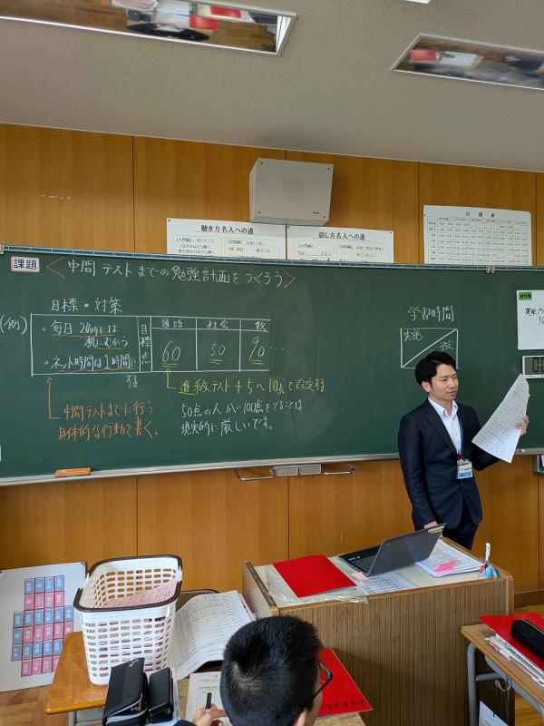 本日(5月9日)、5限目に1年生はテスト計画を作成しました。中学生になってから、初めての定期テストです。わずか1か月ちょっとの間の範囲ですが、この最初のテストがとても重要です。よい点数を取る絶好のチャンスでもあります。やっただけの成果は必ず結果として現れます。そして、よい点数が取れれば、「やればできる精神」が芽生え、今後の勉強に対する取り組み方も変わってくるはずです。誰かと比べるのではなく、まずは自分で計画を立て、目標の点数を決め、最後までやり遂げてほしいと願っています。