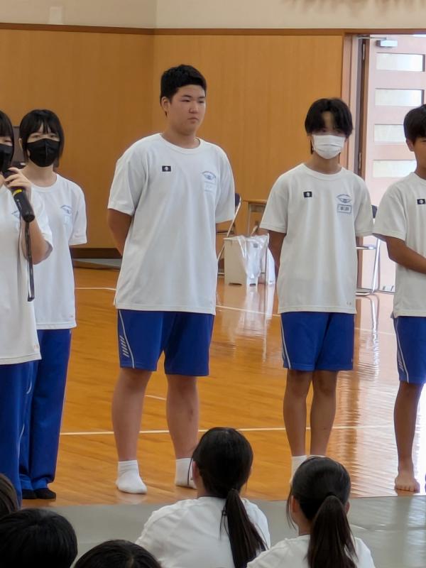 いよいよ来週末河北郡新人大会が始まります。昨日(9月10日)、激励会が行われ各部のキャプテンから意気込みが語られました。こういった舞台に立って話をするのはとても勇気がいることです。ですが、日頃からみんなをまとめていることもあってか、堂々とした姿でとてもかっこよかったです。