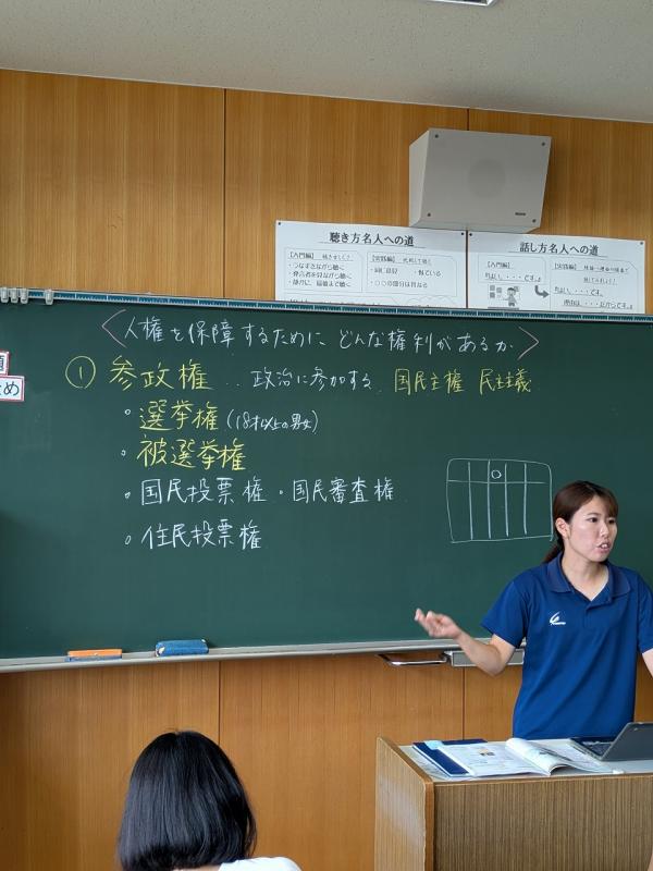 本日(9月19日)、3年2組では社会の授業で「参政権」について学びました。国民が政治に参加する権利、それが参政権です。