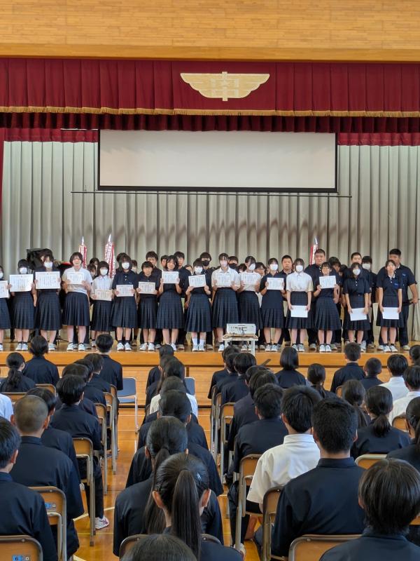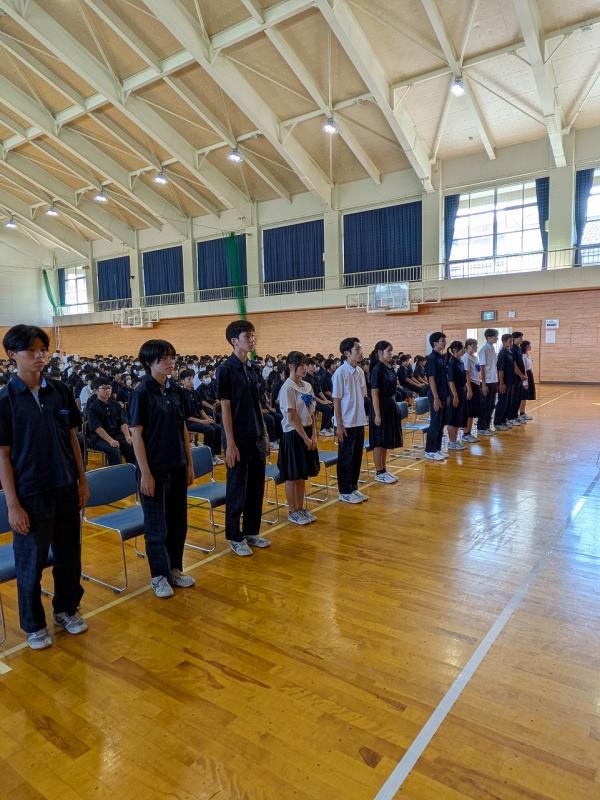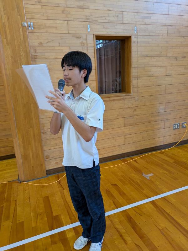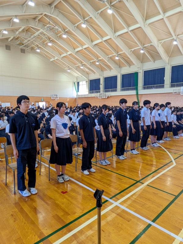 やはり、みんなが一堂に会しての集会は大切なのだなとあらためて感じました。表彰披露を行う生徒、任命式でみんなの前であいさつする生徒・・・。ビデオカメラに向かって話をするのと、600人の目線を感じながら話をするのとではかかるプレッシャーはけた違いです。大きなプレッシャーを乗り越えた先には、また一段成長できます。体育館で行う全校集会は、みんなが集まってこそ意味があるのです。