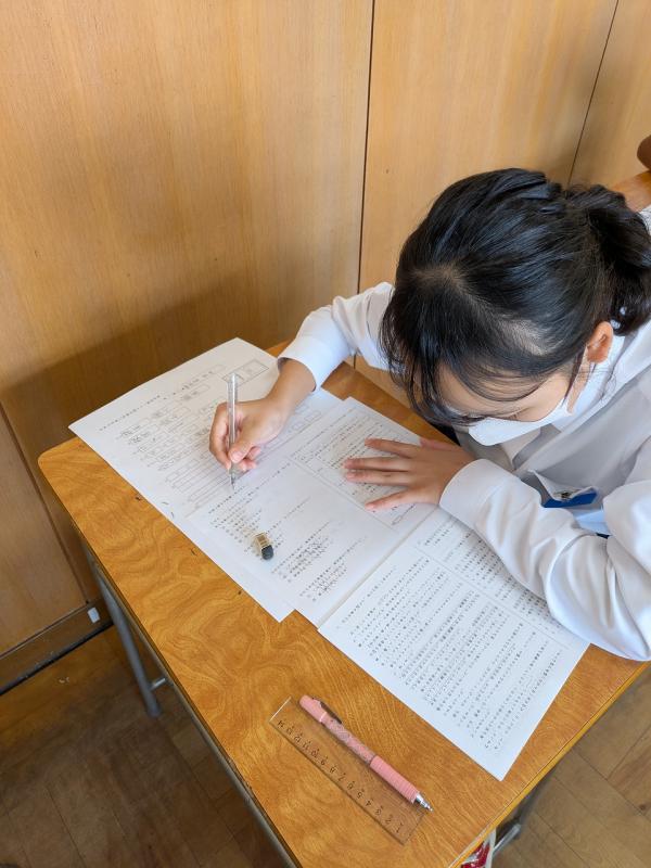 本日(10月22日)、1年6組は書道を行いました。得意、不得意はあるにしろ、みんな真剣です。お手本と自分の字を何度も見比べながら、かなり慎重に書いています。あまりにも何度も目が行ったり来たりするので、字が曲がったりもします。それでいいんです。こういった時間も大切なんです。自分の書いた字に満足げな表情を浮かべる人。隣の人とくらべて複雑な表情を浮かべる人。線が一本足りなくて新しい字を生み出す人・・・。みんなそれぞれです。