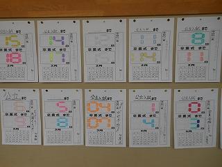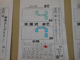 展示ホールには1年生のメッセージが掲示されていますが、3年生の教室前掲示板には生徒が作成した「公立入試」と「卒業式」のカウントダウンカレンダーが掲示されています。本来なら、1枚1枚掲示していく予定でしたが、3月1日からの臨時休校により、残りの枚数を一斉に掲示しました。互いに励まし合うメッセージが添えられています。