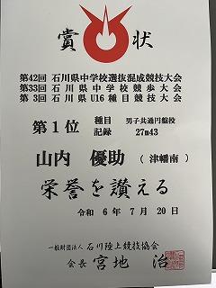 その中で、2年生の山内優助さんが男子共通円盤投で27m43の記録で第1位を勝ち取りました。