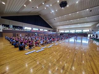 昨日、公式練習を終えた生徒たちは、午後4時から、あいづ総合体育館メインアリーナで行われた開会式に臨みました。学校名プラカードを持って記念撮影も行いました。今日はいよいよ競技開始、津幡南中学校は1回戦で関東ブロック代表の東京都・かえつ有明中学校と対戦します。