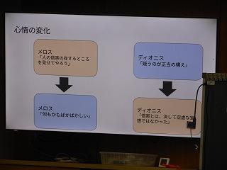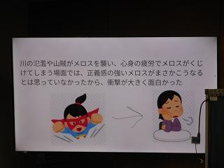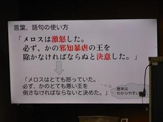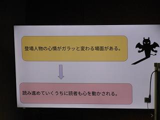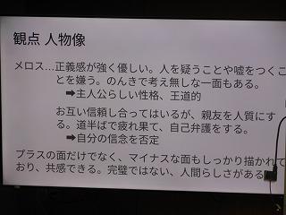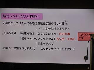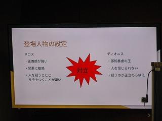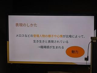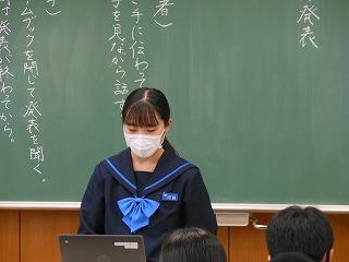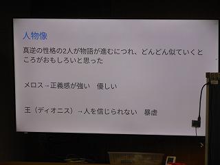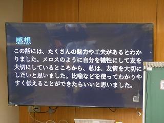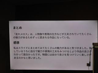 2年生が国語の時間に学んでいる太宰治作の「走れメロス」の学習もまとめに入りました。まとめでは、自分が感じた作品の魅力を観点ごとにスライドに表現しています。各自が作ったスライドをもとに、グループでの発表、全体での発表を行い、級友の感じ方・とらえ方を知ることで、理解を深めていきます。