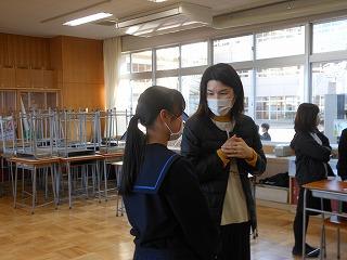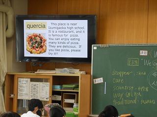 2年生の英語では「Stage Activity 3~My Favorite Place in Our Town」の活動でALTのクロエ先生に津幡町のことを伝える・紹介する情報カードを作っています。来週には一人ひとりがクロエ先生に各自が選んだ見どころを英語で紹介するため、ペアワークで練習に取り組みました。