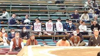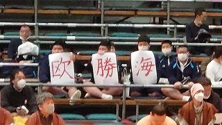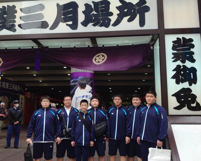 相撲部の部員は、1泊2日の大阪遠征に出かけました。今日は大阪市のエディオンアリーナ大阪で開催されている大相撲春場所見学です。本校の卒業生である欧勝海の取組では、手作りの画用紙を掲げ、見守っていました。結果は見事、欧勝海の勝利!明日は合同稽古で鍛えます。