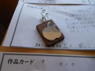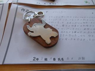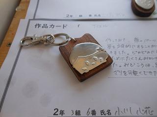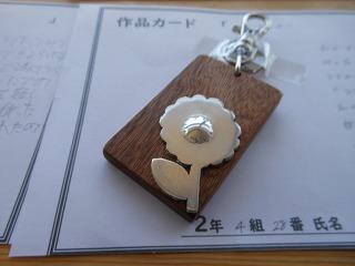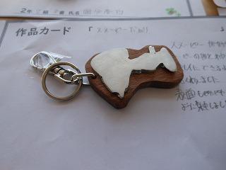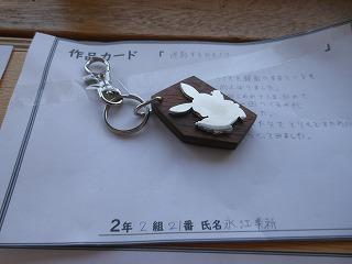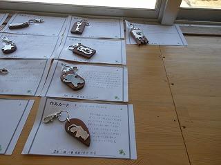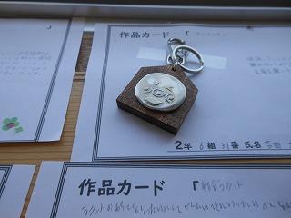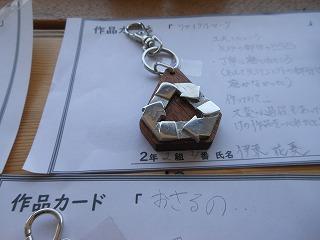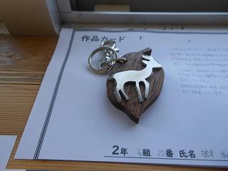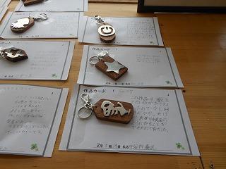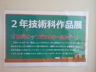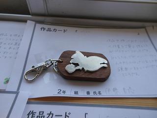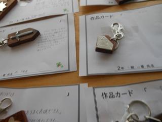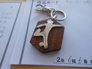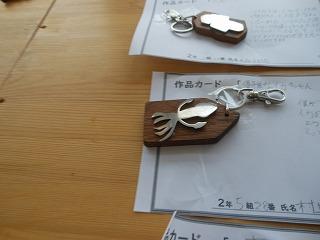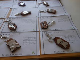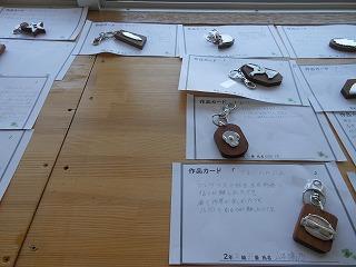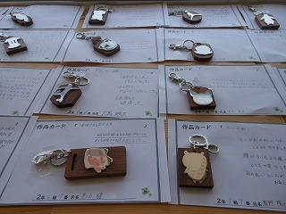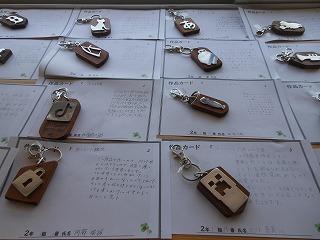 昨日で2年3組と5組の技術が終わり、2年6クラスのキーホルダーが完成しました。残り3日間になりますが、キーホルダー作品展が職員室前で行われています。