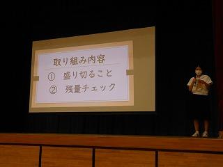 生徒会の時間では、重点委員会である給食委員会が、盛り切りと残菜調査の取組を全校生徒に示しました。
