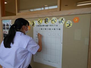 今月の重点委員会である給食委員会の盛り切り週間がスタートしました。先日の全校集会の呼びかけが生徒ホールに展示され、各クラスで給食委員が当番に声をかけ、取り組み始めました。今日はプルコギ丼!調理してくださる方々への感謝の気持ちをもって、おいしくいただきましょう。