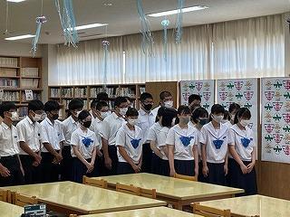 今日も大変暑く、短い時間とはいえ、集合型の集会をやめ、各教室でのリモート集会としました。表彰披露に続いて、永井校長先生のお話、茶谷先生のお話を聞き、最後に北信越大会・全国大会・北陸吹奏楽コンクールの壮行会を実施しました。明日から北信越大会が始まります。詳細は今日配付した「県体・県吹奏楽コンクール結果及び上位大会等のお知らせ」をご覧ください。