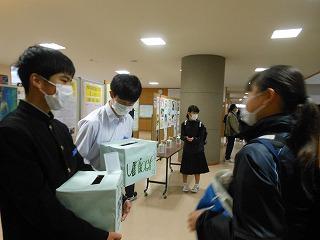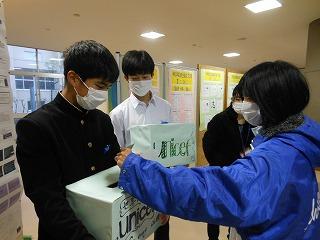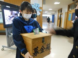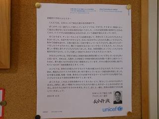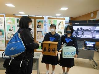 昨日から1週間、生徒会のユニセフ募金活動を行っています。生徒会執行部が展示ホールで募金の呼びかけをしています。大型モニタでは、ユニセフの活動についても紹介されています。あと3日間ありますので、ご協力をお願いします。