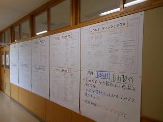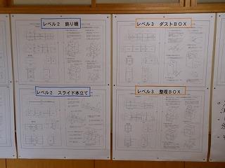 1年の技術科では、木材加工の基礎技術を習得し、いよいよ今月から制作に入ります。技術室前には9つの作品からどれを選んで制作するか拡大掲示がされています。レベル1~3の3段階に分かれており、各自が設計図をもとにしながら選択していきます。