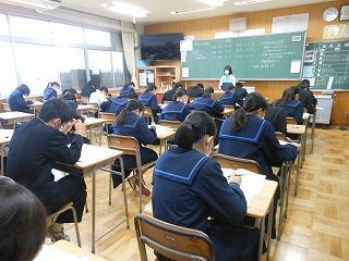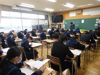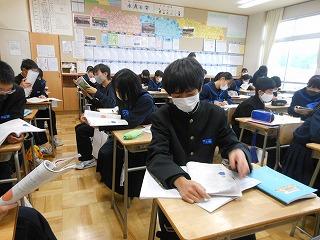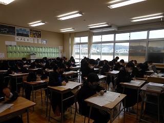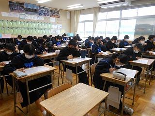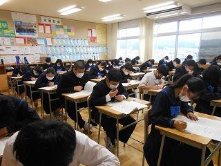 本日、2年生は津幡町学力実態調査に取り組んでいます。午前中に3教科(①国語②数学③理科)の調査に臨み、これまでの学習内容の定着度をはかります。長文記述の問題も多いのですが、じっくり調査問題に取り組む姿勢がみられます。